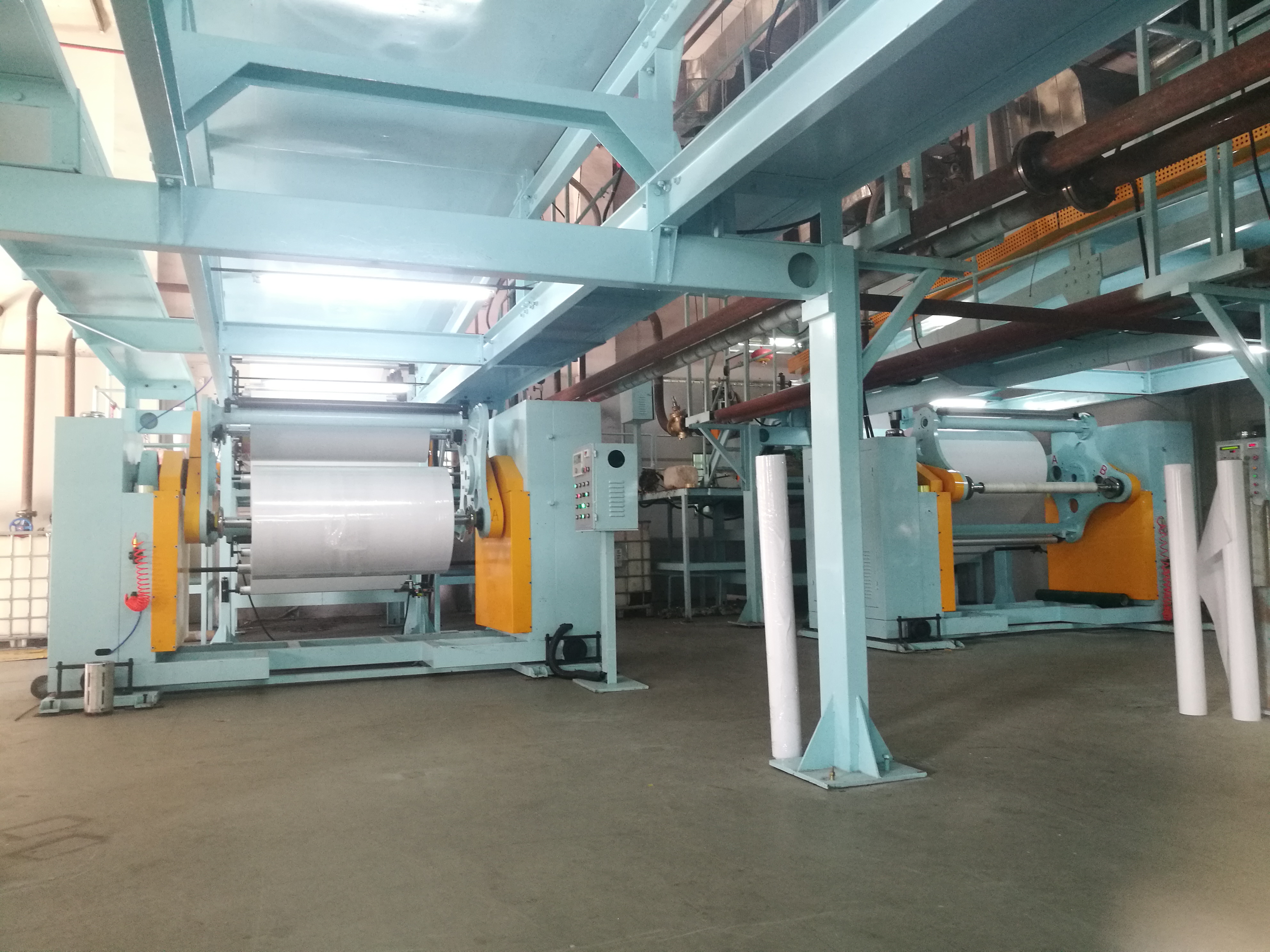 雙面涂布機(jī)采用矢量變頻無(wú)級(jí)調(diào)速大滾筒、牽引輥與網(wǎng)紋輥同步調(diào)速;網(wǎng)紋輥帶刮刀涂布方式,備有多種涂布量的網(wǎng)紋輥供選擇;移動(dòng)式刮刀裝置;采用分段獨(dú)立恒溫半導(dǎo)體不銹鋼發(fā)熱管導(dǎo)熱油交換器加熱風(fēng)干燥系統(tǒng),可調(diào)式內(nèi)循環(huán)吸排氣裝置;烘箱內(nèi)導(dǎo)輥同主軸同步轉(zhuǎn)動(dòng),開門式烘箱及穿膜操作平臺(tái);網(wǎng)紋輥、牽引壓輥由氣動(dòng)電磁閥控制;自動(dòng)計(jì)米裝置;收放卷軸采用鍵子式氣脹軸裝置,裝卸料操作方便;整機(jī)采用PLC電腦系統(tǒng)自動(dòng)控制張力。